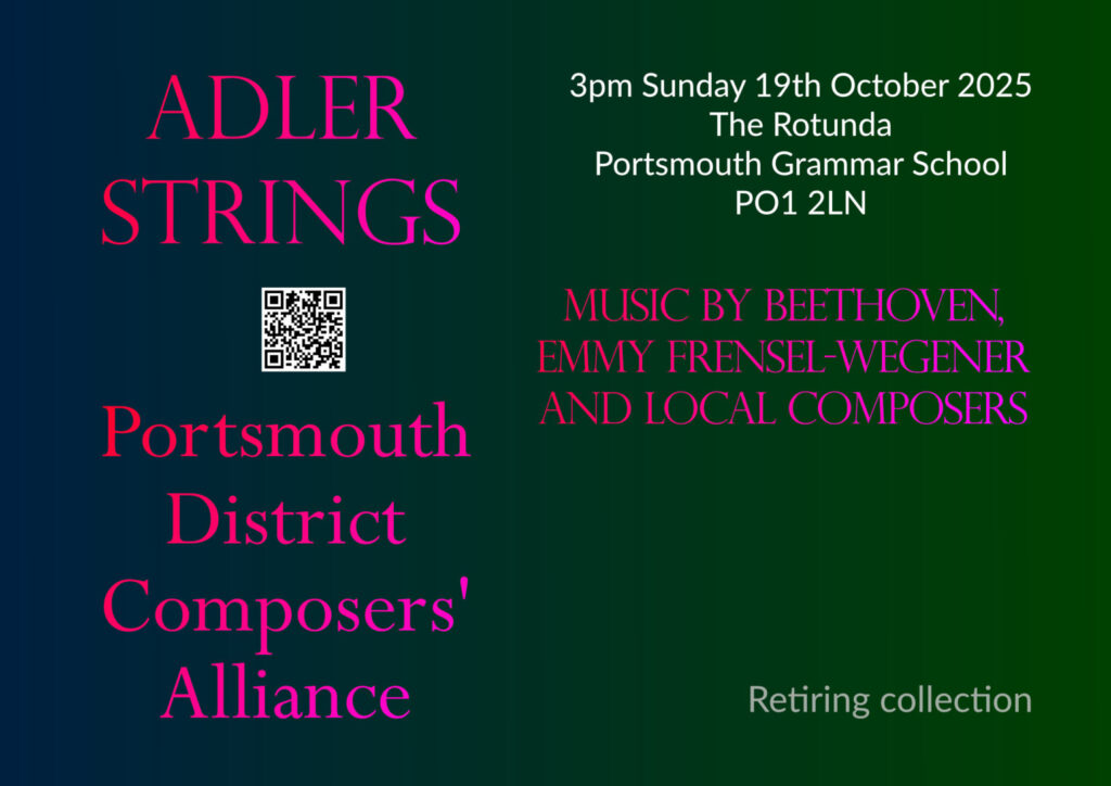 Adler Strings - Portsmouth District Composers' Alliance Concert Temi Salau20th September 2025 Share this page Back StartsSaturday 18 October 2025 3:00 pm EndsSaturday 18 October 2025 4:15 pm VenueThe Rotunda, Portsmouth Grammar School AdmissionFree Suitable for under 18s?Yes AddressPortsmouth Grammar School, 1 High St, Portsmouth, Hampshire PO1 2LN Map Adler Strings - Portsmouth District Composers' Alliance Concert Share this pageContemporary music by local composers for string trio, played by Adler Strings. The programme also includes works by Emmy Frensel-Wegener (1901-1973) and Beethoven. There is a retiring collection. Share this page Share this page