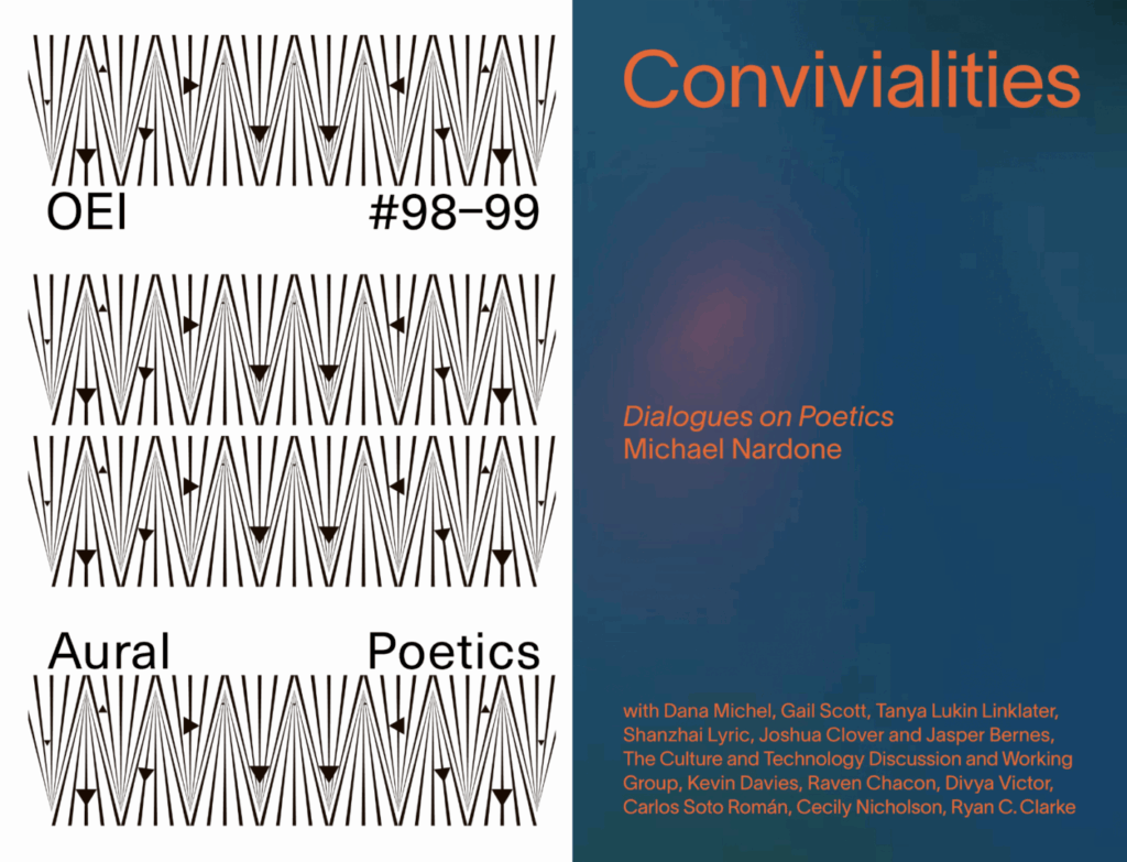 Aural Poetics/Convivialities is a weekend centering poetics and sonic practices. Montréal-based poet and editor Michael Nardone convenes the artists and writers involved in two recent works – Aural Poetics and Convivialities – to discuss their compositional practices and share audio related to the projects. The Aural Poetics/Convivialities programme will unfold over two days.