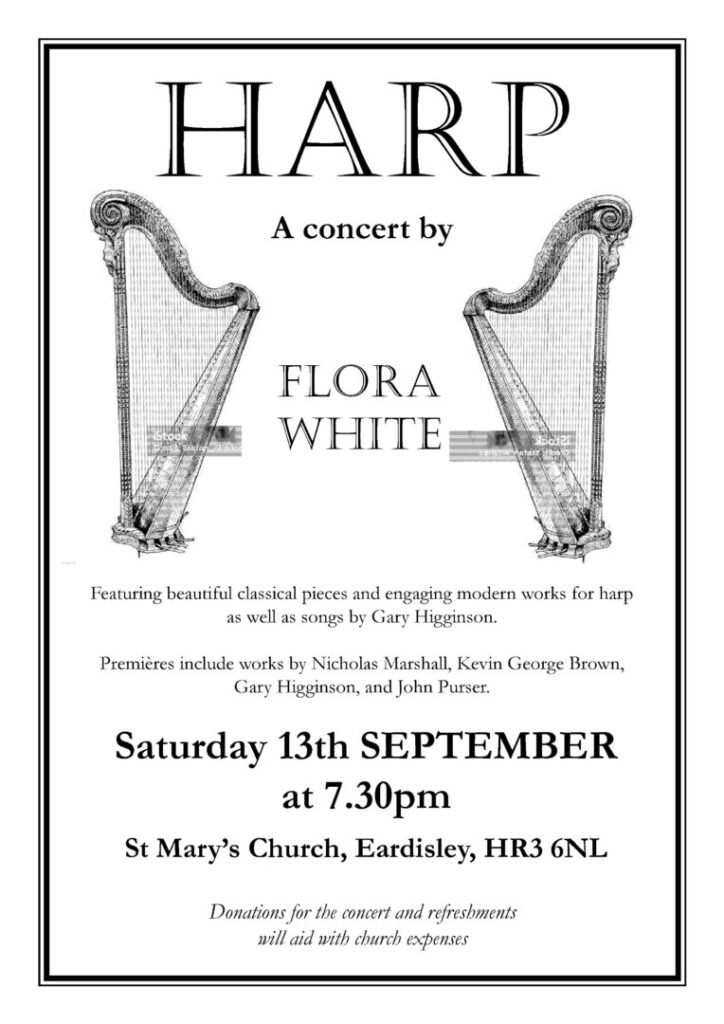 Harp Concert with Flora White Sound and Music27th August 2025 Share this page Back StartsFriday 12 September 2025 7:30 pm VenueSt Mary's Church, Eardisley, Herefordshire HR3 6NL AdmissionTicket priceDonations welcome Suitable for under 18s?Yes Harp Concert with Flora White Flora White performs an evening of harp music featuring a world premiere In Memoriam by Kevin George Brown. Share this page