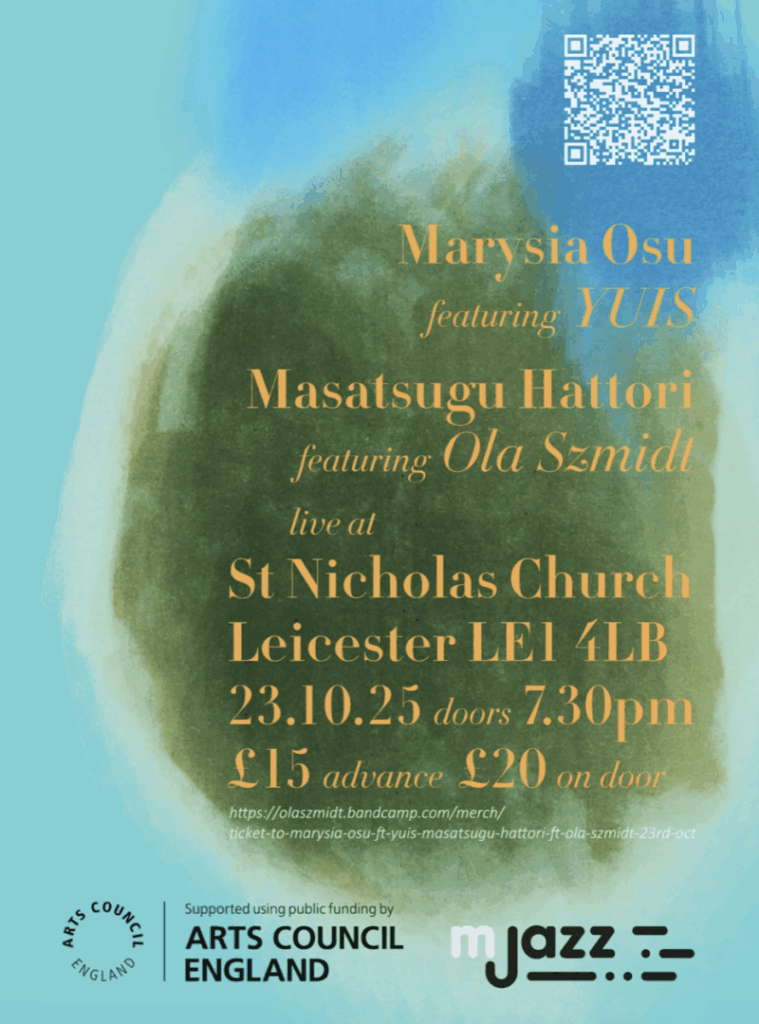 Join us at the beautiful and sacred St Nicholas Church, Leicester, for a live performance featuring Marysia Osu (harpist and producer) and YUIS (flutist), accompanied by Tokyo-based drummer and vibraphonist Masatsugu Hattori and Leicester-based vocalist and flutist Ola Szmidt.
